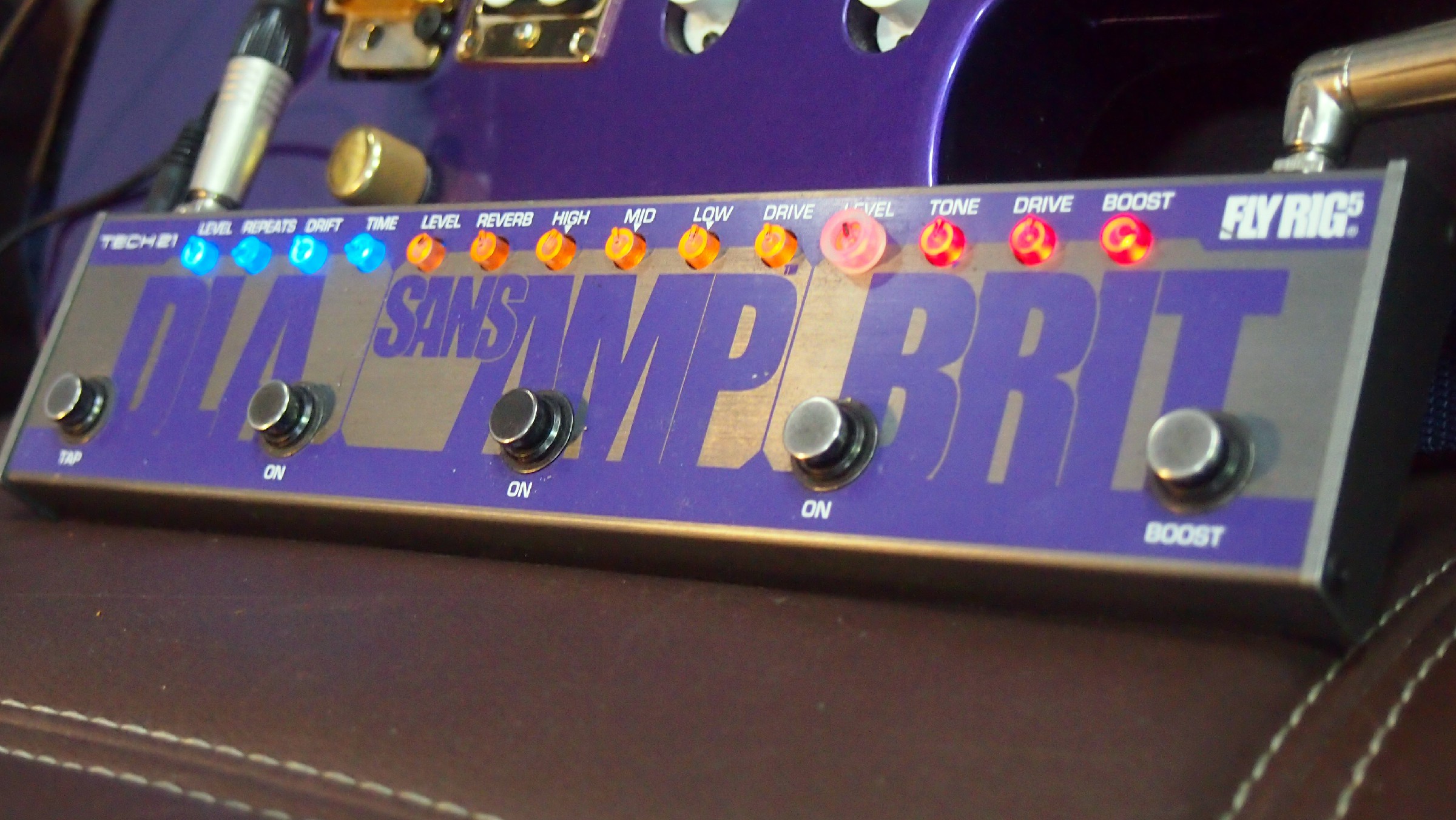 Here comes the BRIT version of the Fly Rig 5 by Tech21. It comes in violet theme, bright knobs and amazing sound. It has the simplicity design like the Flyrig 5 first version, but surely this BRIT has more of something than the first flyrig5 has.